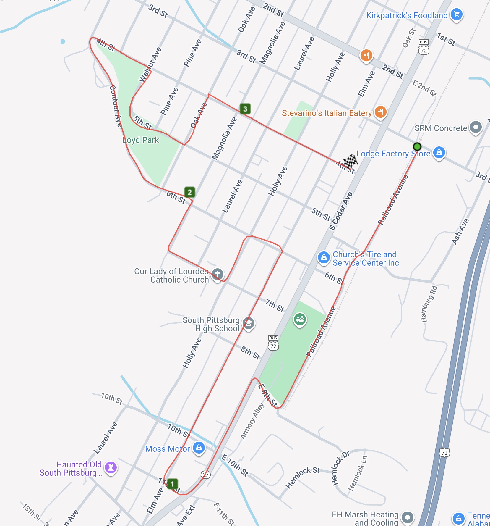The race starts at the Lodge Foundry at 8am CDT and finishes at South Pittsburg Elementary School. Click to see the 5K Course Map.